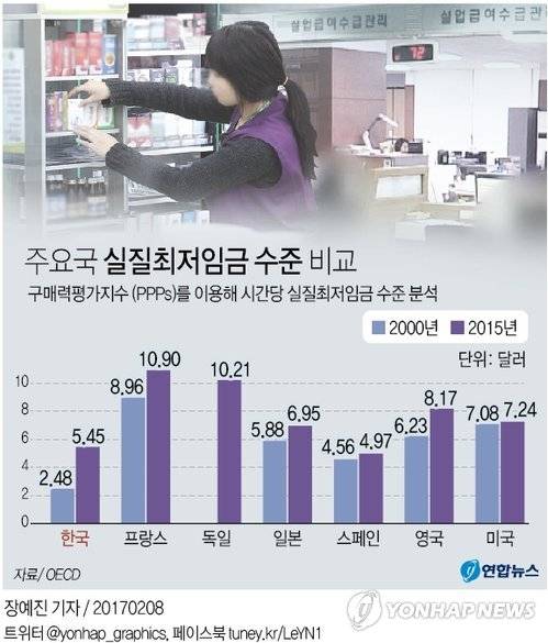 그러나 구매력평가지수(PPPs)를 이용해 시간당 실질최저임금 수준을 분석한 결과 우리나라는 2015년 5.45달러로 10.90달러인 프랑스의 절반에 불과했다.