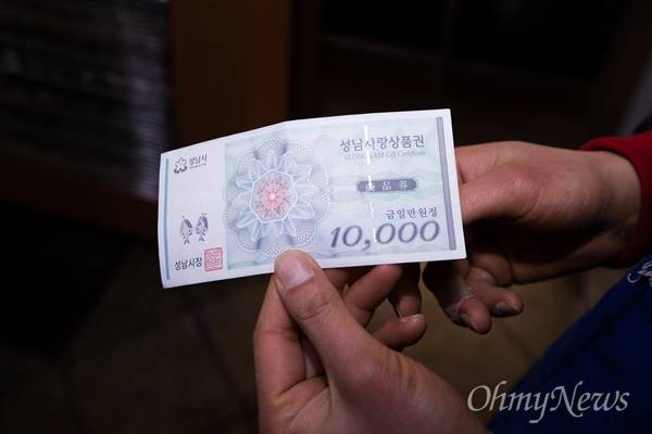 | ▲ 청년배당에 사용되는 성남사랑상품권 대선예비후보 이재명 성남시장이 20일 오전 경기도 성남 상대원재래시장을 방문해 성남시에 거주하는 청년들과 함께 청년배당(기본소득) 체험행사를 하며 사용한 성남사랑상품권 1만원 권. |