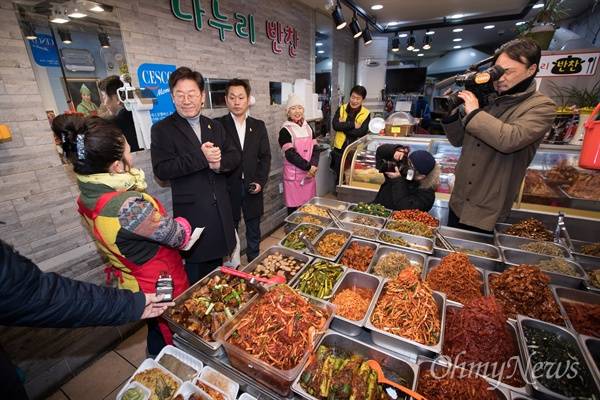 | ▲ 이재명 반찬가게에서도 지역화패 대선예비후보 이재명 성남시장이 20일 오전 경기도 성남 상대원재래시장을 방문해 성남시에 거주하는 청년들과 함께 청년배당(기본소득) 체험행사를 하고 있다. 이 시장은 물품 구매를 청년배당 지역화패인 성남사랑 상품권으로 현금 대신 지불 했다. |