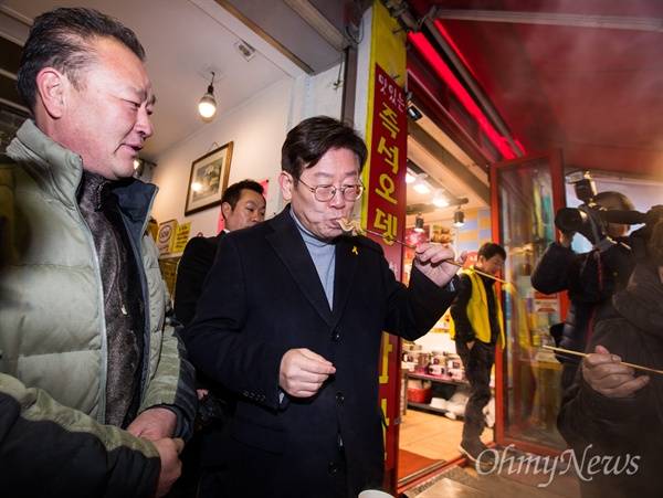 | ▲ 시장 어묵 먹고 있는 이재명 대선예비후보 이재명 성남시장이 20일 오전 경기도 성남 상대원재래시장을 방문해 성남시에 거주하는 청년들과 함께 청년배당(기본소득) 체험행사를 마치고 즉석어묵을 먹고 있다. |