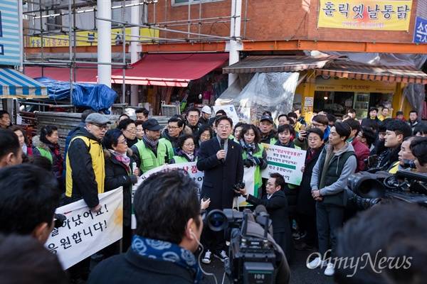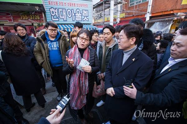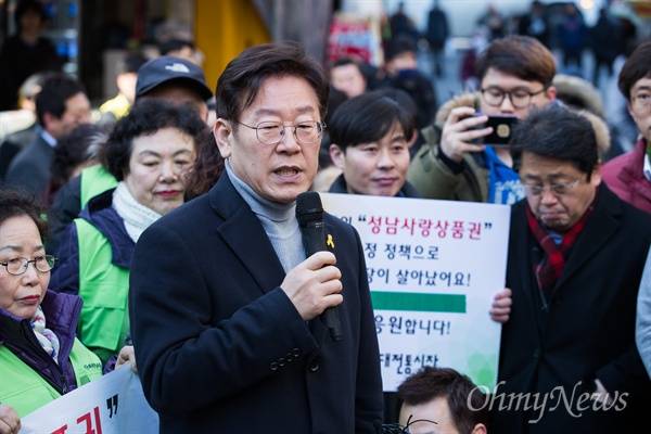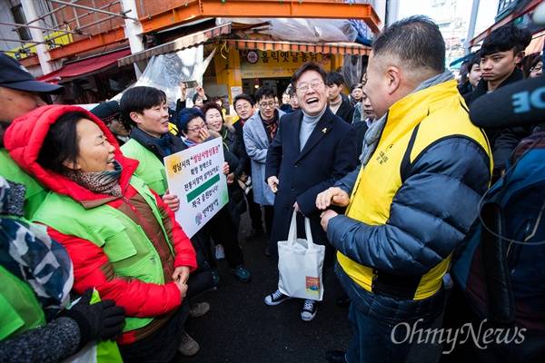 | ▲ 대선예비후보 이재명 성남시장이 20일 오전 경기도 성남 상대원재래시장을 방문해 성남시에 거주하는 청년들과 함께 청년배당(기본소득) 체험행사를 하고 상인들과 대화를 하고 있다. |