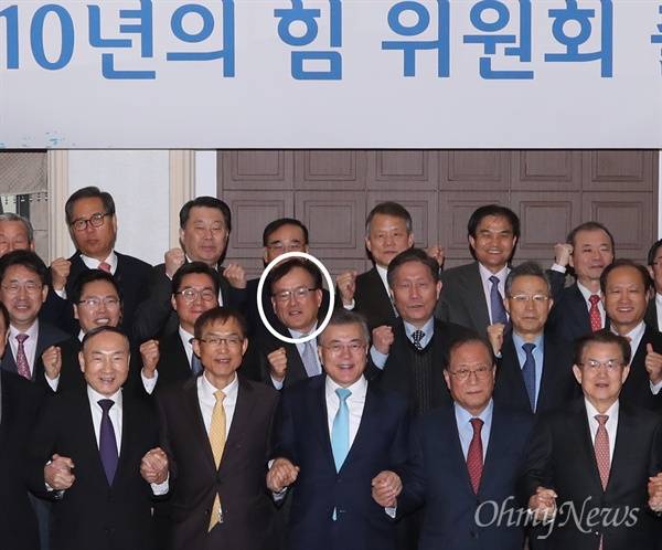 | ▲ 문재인 더불어민주당 전 대표가 지난 2월 14일 서울 프레스센터에서 열린 '10년의 힘 위원회' 출범식에서 참석자들과 함께 포즈를 취하고 있다. 흰색 원 안의 인물이 진익철 전 서초구청장이다. |