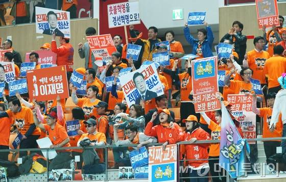 27일 오후 광주광역시 광산구 광주여대에서 열린 더불어민주당 19대 대통령후보자 호남권역 선출대회에서 이재명 경선후보의 지지자들이 피켓을 들고 임을 위한 행진곡을 부르고 있다.