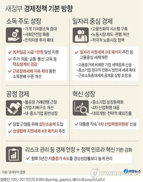 (세종=연합뉴스) 김수현 기자 = 정부가 25일 발표한 '새정부 경제정책방향'에는 경제 성장은 소득주도로, 경제 체질은 일자리 위주로 전환하겠다는 소득 주도 성장 5년 청사진이 담겼다.