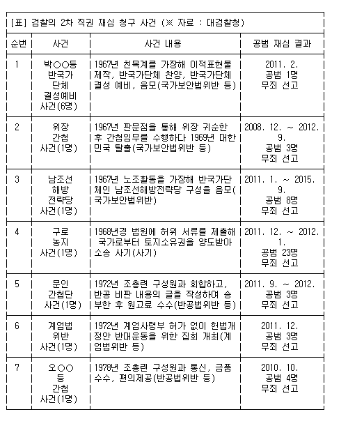 검찰은 이 밖에도 1967년 친목계를 가장한 반국가단체를 결성했다는 이유로 징역 4년형을 받은 박모씨 등 관련자 6명, 1967년 판문점을 통해 위장 귀순한 뒤 간첩으로 활동하다가 도망친 혐의로 사형을 선고받은 이모씨 사건의 재심을 청구한다.