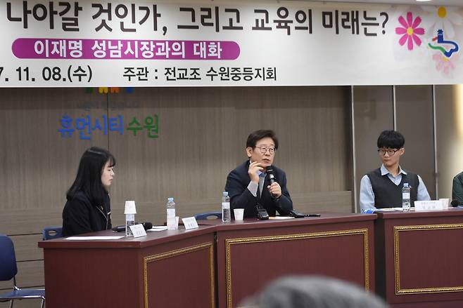 지난 8일 오후 7시 이재명 성남시장은 '한국사회 어떻게 나아갈 것인가, 그리고 교육의 미래는?'이라는 주제로 경기 수원시 장안구청 대회의실에서 수원시민들과 이야기를 나눴다.
