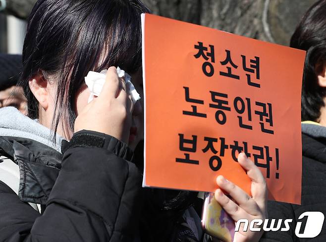 (서울=뉴스1) 이재명 기자 = 30일 오전 서울 세종대로 정부서울청사 앞에서 열린 산업체 파견 현장실습 폐지 촉구 기자회견에서 특성화고 졸업생 복성현씨가 발언을 하는 도중 눈물을 흘리고 있다. 2017.11.30/뉴스1