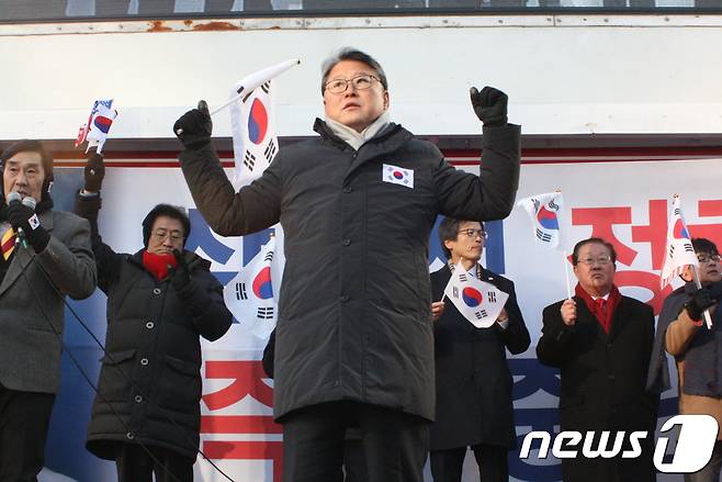 (대구=뉴스1) 정지훈 기자 = 6일 조원진 대한애국당 대표가 대구 중구 반월당에서 열린 '박근혜 대통령 인권유린 중단 및 무죄 석방 촉구 태극기집회'에서 발언을 하고 있다. 2018. 1. 6/뉴스1