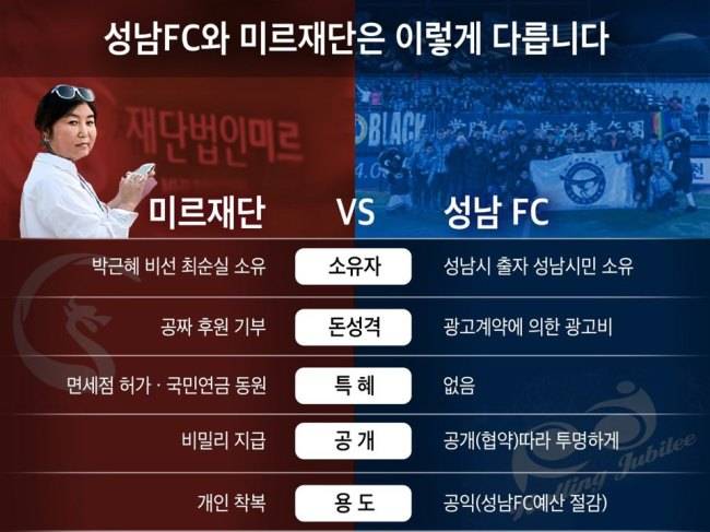 도표에는 미르재단 소유자는 박근혜 전대통령 비선 최순실 소유이지만 성남FC는 성남시 출자 성남시민 소유임을 밝혔다. 돈성격도 미르재단은 공짜후원 기부이지만 성남FC는 광고계약에 의한 광고비라는 차이점을 제시했다.