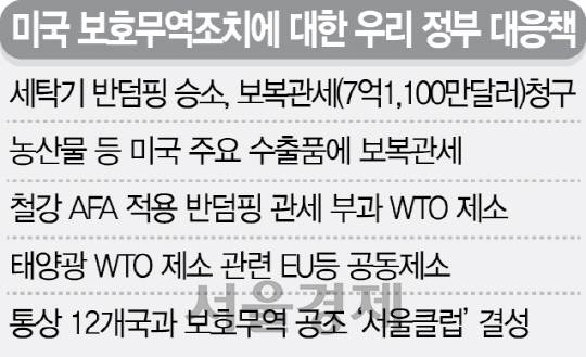 25일 통상당국의 한 관계자는 “세이프가드 관련 분쟁은 반덤핑과 달리 판정이 나오면 바로 보복권한이 생긴다”면서 “다음달 세계무역기구(WTO)에 제소하기 전에 양허 정지 신청(보복관세)을 먼저 해놓고 최종 결과가 나오면 바로 보복할 수 있도록 준비하고 있다”고 말했다. 이와 관련해 산업통상자원부는 보복관세를 매길 품목과 산정 금액 추산 등 실무작업을 진행하고 있는 것으로 알려졌다. 양허 정지란 WTO 분쟁에서 이길 경우 승소 국가가 피해를 복구하기 위해 패소 국가에 보복관세를 매길 수 있도록 부여하는 권리를 말한다. 우리 정부는 지난 22일 2016년 WTO에서 최종 승소한 세탁기 반덤핑 분쟁과 관련해 7억1,100만달러(7,550억원)의 양허 정지 신청을 한 바 있다. 최원목 이화여대 법학전문대학원 교수는 “세탁기 쿼터가 120만대인데 연간 300만대 분량의 수출이 그렇게 쪼그라들 수도 있다는 것을 감안하면 세탁기만 놓고 봐도 보복관세 규모가 크게 커질 수 있다”고 말했다.