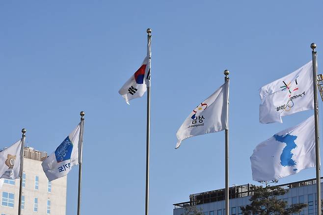 | ▲ 평창 올림픽기와 한반도기가 게양된 모습 |
