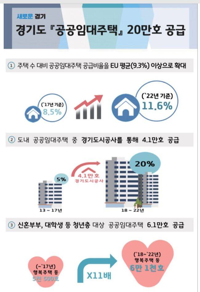 도는 그동안 한국토지주택공사에 의존하던 수동적 공급 방식에서 탈피하고 경기도시공사를 통해 5년간 공공임대주택 20만호의 약 20%인 4만1000호를 직접 공급하며 책임감 있는 주거복지를 실현해 나갈 계획이다.