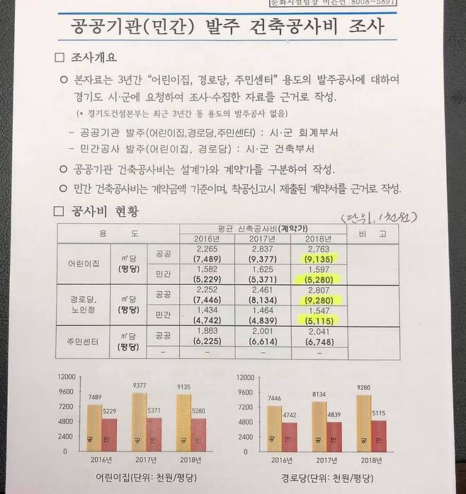 경기도가 지난 3년간 도내 어린이집, 경로당 등의 건축공사비를 조사한 결과 공공기관 발주 공사가 민간 발주 공사보다 1평당 약 400만 원을 더 지급한 것으로 나타났다.