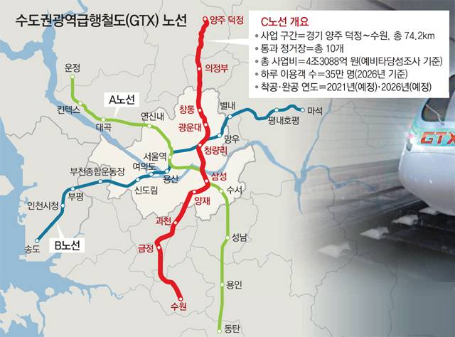 GTX C노선은 경기 양주시 덕정동을 출발해 의정부, 청량리, 삼성, 양재 등을 거쳐 경기 수원시까지 가는 급행철도 노선이다.