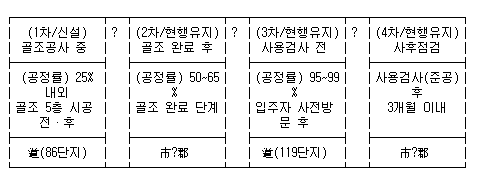 현재 아파트 품질 검수는 ▲'골조 완료 후'(공정률 50∼65%에서 시·군에서 진행) ▲'사용검사 전'(입주자 사전방문 후 공정률 95∼99%에서 도에서 진행) ▲'사후점검'(준공 후 3개월 이내에 도에서 품질 검수 지적사항 이행 여부 등을 확인) 등 3단계로 진행하고 있다.