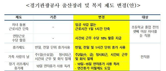 유동규 경기관광공사 사장은 "세 자녀 이상 직원의 근무시간 단축과 시간외 수당 증액이 국가 차원 저출산 문제 해결 실마리가 되길 기대한다"고 했다.