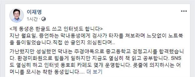 22일 이재명 경기도지사는 자신의 SNS를 통해 자신의 공판과 관련해 증인으로 출석한 막내 동생을 안타까워했다.