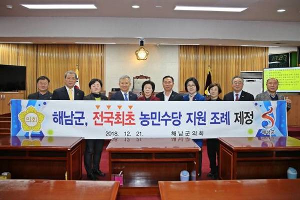 한편 전라남도 해남군(명현관 군수)은 전국 최초로 농민기본소득을 지급하고 나섰다. 민선 7기 출범 핵심공약으로 농민수당 도입을 추진한 결과 지난 2018년 9월부터 약 7개월간 보건복지부와의 협의를 거쳐, 12월 마침내 '해남군 농업보전 등을 위한 농민수당 지원 조례'를 제정했다. 그리고 올해 6월부터 해남사랑상품권으로 연 60만 원(반기별 30만 원) 균등 지원하기 시작했다.