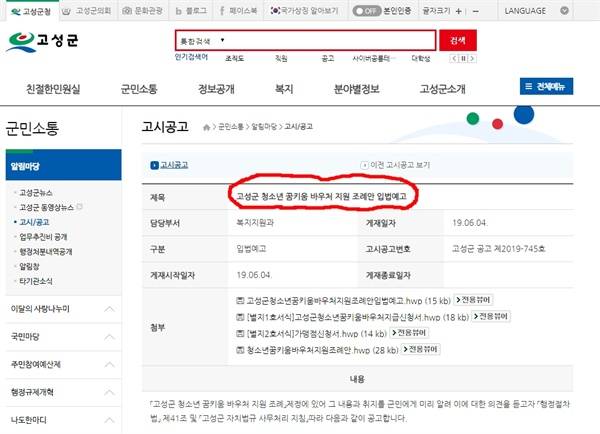 6월 4일 경남 고성군청 홈페이지에 '고성군 청소년 꿈키움 바우처 지원 조례안 입법예고'가 되었고, 6월 24일까지 의견을 접수 중이다.