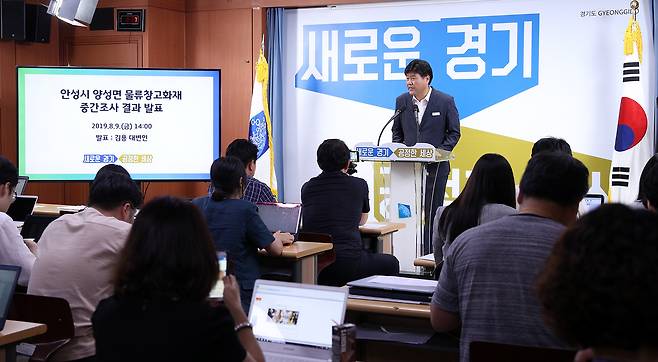 | ▲ 김용 경기도 대변인은 9일 오후 경기도청에서 기자회견을 열고 “화재로 순직한 고(故) 석원호 소방위의 명복을 빌며, 부상을 당한 분들의 빠른 쾌유를 기원한다”라고 밝힌 뒤, 지난 6일 오후 1시 14분 발생한 안성시 양성면 석화리 34-2번지 물류창고 화재에 대한 중간조사 결과를 발표했다. |