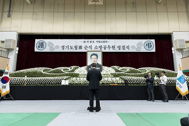 | ▲ 지난 6일 경기도 안성시 양성면 생활용품 제조공장 화재 진압 중 원인미상의 폭발 사고로 순직한 故 석원호 소방위 경기도청장 영결식이 8일 오전 10시 안성시체육관에서 경기도청장으로 거행됐다. 이날 영결식에는 장의위원장인 이재명 경기도지사와 조문객 등이 참석해 국민의 안전을 위해 희생한 소방관의 명복을 빌었다. |
