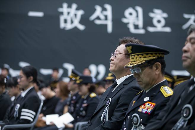 | ▲ 이재명 경기도지사는 8일 오전 10시 안성시체육관에서 열린 ‘고 석원호 소방위 영결식’에 참석해 "석원호 소방위는 마지막까지 참된 소방관이었다"며 고인의 희생을 애도했다. |