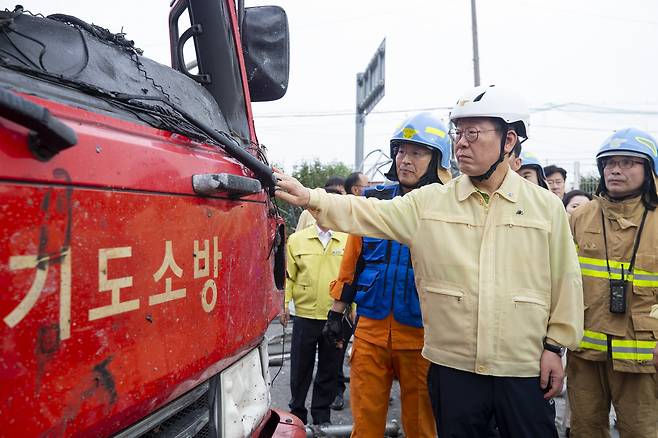 | ▲ 이재명 경기도지사는 지난 6일 안성시 양성면에서 발생한 화재 현장을 찾아 화재 진압 중 순직한 고(故) 석원호 소방위를 애도했다. 이재명 지사는 특히 "폭발사고라 더욱 피해가 컸는데 철저한 원인 규명이 필요하다”면서 “공장 내에 화재를 키울 만한 불법적인 요소가 있었는지도 확인해 달라”고 주문했다. |