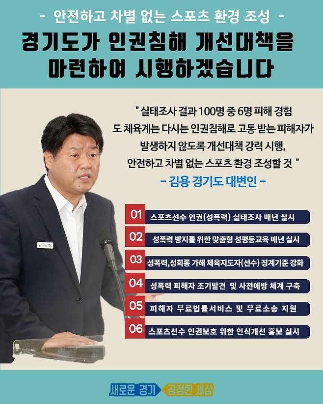 김용 대변인은 "다시는 경기도 체육계에 인권침해로 고통받는 피해자가 발생하지 않도록 개선대책을 적극 시행해 안전하고 차별 없는 스포츠 환경을 만들어나가겠다"고 강조했다.