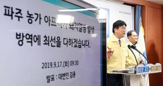 김용 경기도 대변인은 17일 오전 긴급 기자회견을 열고 '파주 돼지농장 발생현황과 도 및 시·군 방역대책'을 발표했다 김용 대변인은 "경기도는 돼지열병 유입 방지를 위해 노력해 왔으나, 안타깝게도 파주의 돼지농가에서 발생해 농림축산식품부가 오늘 새벽 오전 6시30분경 확진 발표했다"면서 "농림축산식품부와 경기도는 위기단계를 '심각단계'로 높여 발령하고, 가축질병 위기대응 매뉴얼 및 'ASF 긴급행동지침'에 따른 기관별 방역조치 등에 들어갔다"고 말했다.
