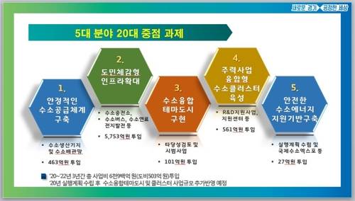 5대 추진 목표는 2030년까지 수소생산기지 10곳 발굴, 수소 배관망 100㎞ 확대, 수소차 13만대· 수소버스 4천대 보급·수소충전소 200곳 설치, 수소연료전지발전 1GW 구축, 주력사업융합형 수소 클러스터 육성 등이다.