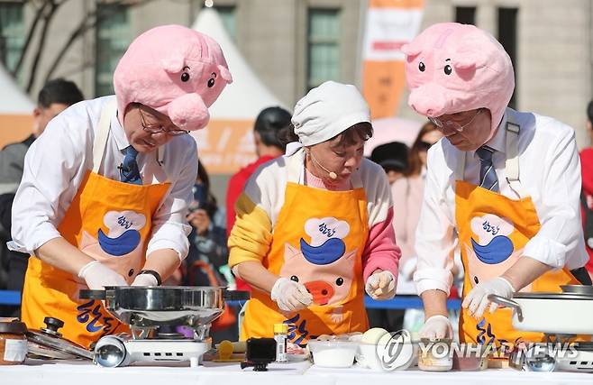 (서울=연합뉴스) 류영석 기자 = 박원순 서울시장(오른쪽)과 이재명 경기도지사(왼쪽)가 1일 오후 서울 중구 서울광장에서 열린 우리돼지 한돈 살리기 캠페인 행사장에서 방송인 김수미 씨(가운데)와 돼지고기 요리를 하고 있다. 2019.11.1