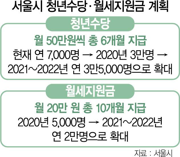 서울시는 50만 원씩 6개월간 지급하는 청년수당의 대상을 내년 3만 명, 2021~2022년 각 3만5,000명으로 늘릴 계획이다. 이는 중앙정부의 청년구직활동지원금 등의 수혜를 받지 못하는 인원을 추산한 것으로 일종의 ‘청년 대상 기본소득’이다.