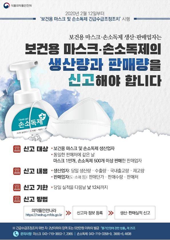 식품의약품안전처는 12일 신종 코로나바이러스로 인한 보건용 마스크와 손소독제의 품귀현상으로 국민적 우려가 커짐에 따라, 물가안정법 제6조에 근거해 '보건용 마스크 및 손소독제 긴급수급조정 조치 고시'를 이날 0시부터 4월 30일까지 한시적으로 시행한다고 밝혔다. 이에 따라 보건용 마스크·손소독제의 생산·판매업자는 이날부터 생산·판매한 제품에 대해 식약처에 매일 신고해야 한다.