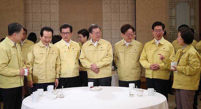| ▲ 문재인 대통령이 4일 오전 청와대에서 열린 국무회의에 앞서 참석자들과 대화하고 있다. 왼쪽부터 박능후 보건복지부 장관, 정세균 총리, 이시종 충북도지사, 문 대통령, 이재명 경기도지사, 양승조 충남지사, 추미애 법무부 장관. |