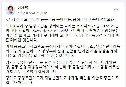 이재명 경기지사는 지난 2일 페이스북을 통해 "조달청 나라장터가 시장 단가보다 비싸게 판매하면 지방정부는 어쩔 수 없이 그 가격에 구매해야 한다"며 이는 "나라장터의 독점적 지위에 따른 폐해"라고 지적했습니다.