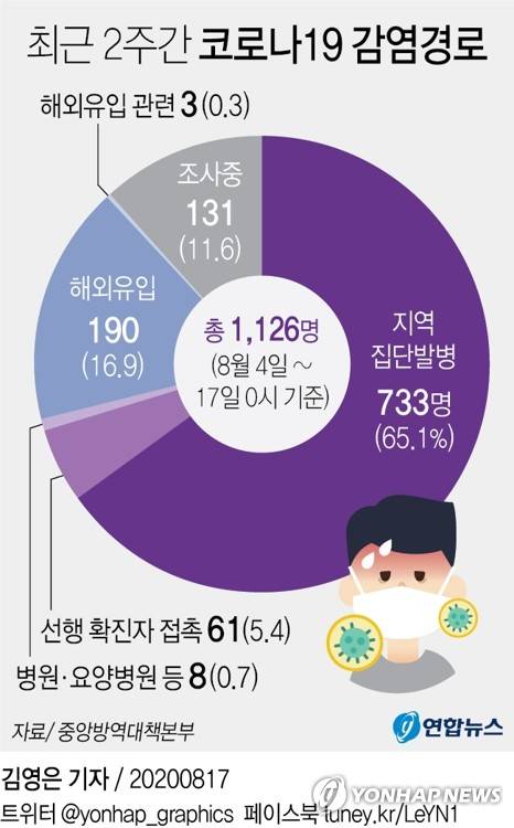 이런 상황은 최근 통계에도 잘 나타난다. 4일부터 이날까지 최근 2주간 감염 경로를 보면 신규 확진자 1천126명 중 733명(65.1%)이 국내 집단발병으로 인해 확진 판정을 받았다. 여기에 조사가 진행 중인 '깜깜이 환자'도 131명(11.6%)이나 된다.