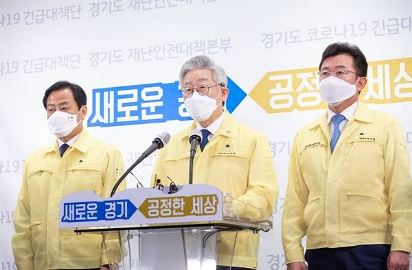 | ▲ 경기도 ‘추석경기 살리기 소비지원금 명목 한정판 지역화폐’ 지급 긴급 기자회견 9일 이재명 경기도지사와 장현국 경기도의회 의장 및 박근철 경기도의회 더불어민주당 대표의원이 경기도청에서 긴급 합동 기자회견을 열고 ‘추석경기 살리기 소비지원금 명목 한정판 지역화폐’ 지급 계획을 발표 하는 장면 |