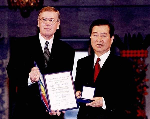 "노르웨이 노벨위원회는 2000년 노벨평화상 수상자로 한국과 동아시아 민주주의와 인권 신장 및 북한과의 화해와 평화에 기여한 한국의 김대중을 선정했다. 한국에서 수십 년 동안 지속된 권위주의 체제 속에서 계속된 생명의 위협과 기나긴 망명 생활에도 불구하고 김대중은 한국 민주주의의 대변자였다. 그가 1997년 대통령 선거에 당선됨으로써 한국은 세계 민주주의 국가 대열에 들었다."