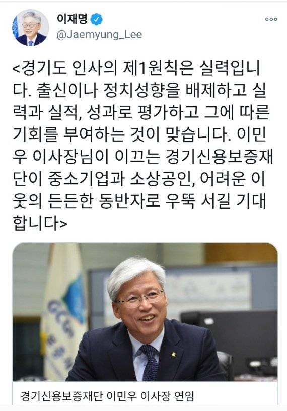 이 지사는 이날 트위터를 통해 "이민우 이사장이 이끄는 경기신용보증재단이 중소기업과 소상공인 어려운 이웃의 동반자로 우뚝 서길 기대한다"며 이같이 말했다.