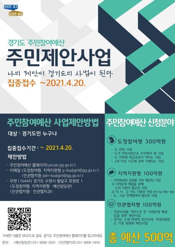 한편, 2020년에는 경기도에 500건의 주민참여예산 사업제안이 접수돼 횡단보도 집중조명 설치, 아이스팩 순환사업 등 48건, 154억원 규모의 주민제안사업이 2021년 예산에 편성됐다.