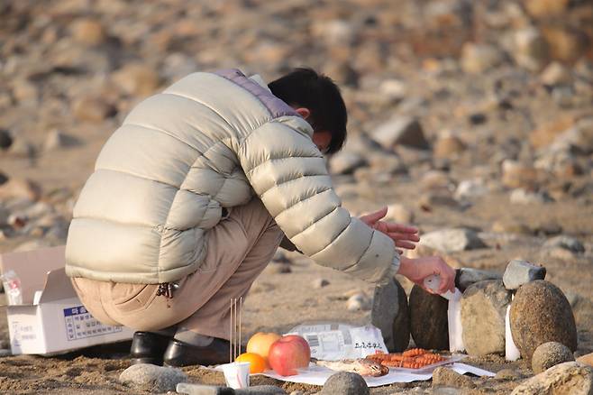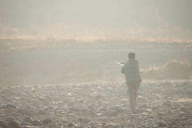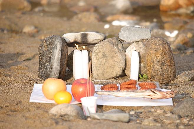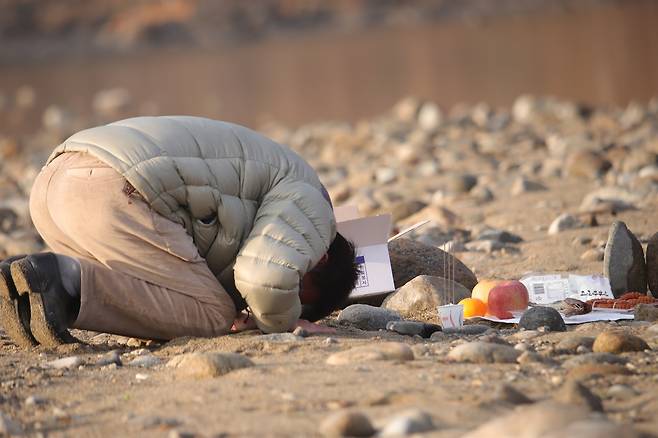 음력 1월 15일, 26일은 정월대보름입니다. 지리산의 엄천강과 덕유산의 위천이 만나는 경호강 두물머리에서 동네 주민이 소소한 차림으로 간절하게 기도를 하고 있습니다. 코로나 시국 아니라면 보통의 보름날엔 더위를 서로 팔고 사고 하겠지만 지금은 그냥 무사히 잘 견디기만을 간절히 바랄 뿐입니다.
