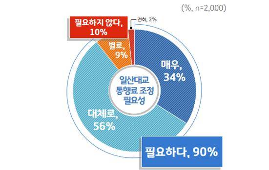 경기도민 10명 가운데 9명이 일산대교 통행료 조정이 ‘필요하다’고 생각하고 있는 것으로 나타났다.