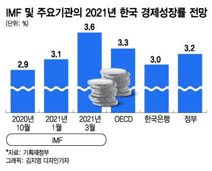 IMF는 26일 오전(한국시간) 한국과의 연례협의 보고서를 통해 2021년 성장률을 1월 전망대비 0.5%포인트 올린 3.6%로 전망한다고 밝혔다. 경제협력개발기구(OECD)와 한국은행, 정부가 각각 3.3%, 3%, 3.2% 성장을 전망한 것을 고려하면 가장 높은 수준의 성장률을 제시했다.