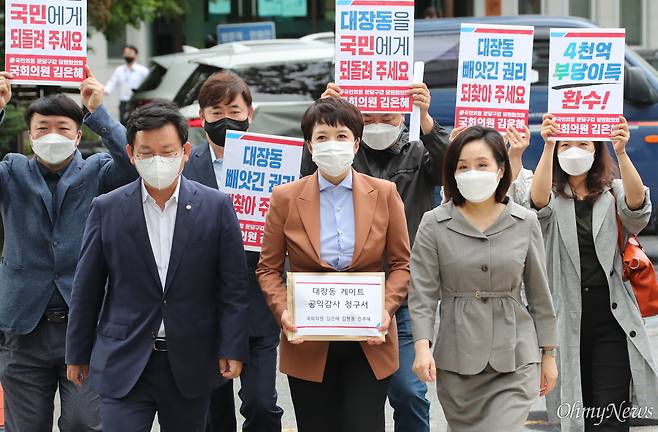 | ▲ 국민의힘 대장동 TF 김형동(좌부터) 김은혜, 전주혜 의원과 대장동 주민들이 6일 공익감사청구서를 제출하기 위해 감사원 민원실에 들어서고 있다. |