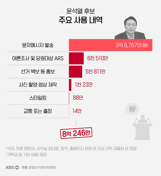 윤 후보의 신고된 지출 내역 가운데서는 '당원용 문자메시지 충전' 등 문자메시지 발송 비용이 3억 6천여만 원으로 가장 많았습니다. 뒤이어 국민리서치그룹에 여론조사 2회, 4천510만 원과 당원 대상 ARS 2천만 원 등 모두 6천5백여만 원, 선거 벽보 제작과 경선 홍보물 인쇄비 등으로 5천8백여만 원을 썼습니다.