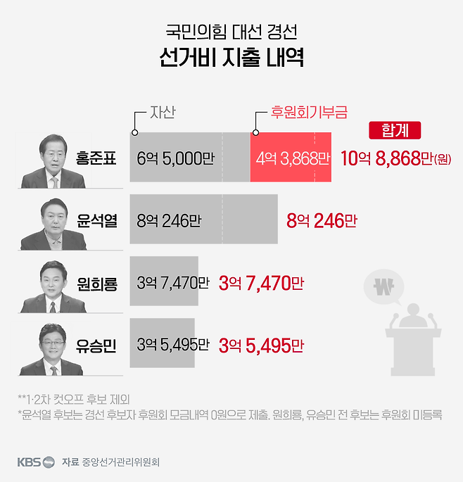 선관위에 제출된 내역에 따르면 홍준표 전 후보가 경선 과정에서 후원회기부금 4억 3천여만 원을 포함한 10억 8천여만 원을 지출해 선거비를 가장 많이 쓴 것으로 나타났습니다. 뒤이어 윤석열 후보 8억여 원, 원희룡 전 후보 3억 7천여만 원, 유승민 전 후보 3억 5천여만 원 순이었습니다.