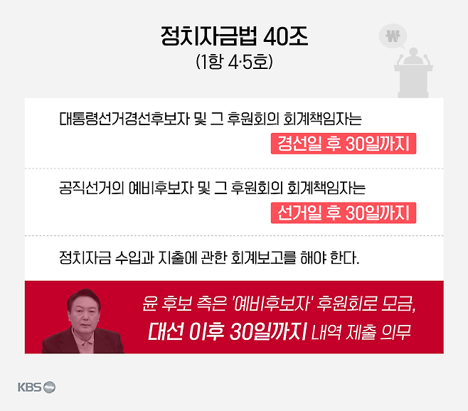 윤 후보 측의 설명에 따르면 예비후보자 후원회 계좌에서 8억여 원을 경선 과정에서 사용했으므로, 총 후원금에서 남은 약 17억 원의 사용 내역, 그리고 고액 후원자 명단은 정치자금법에 따라 대선 종료 30일 이내 제출하도록 되어 있는데요.