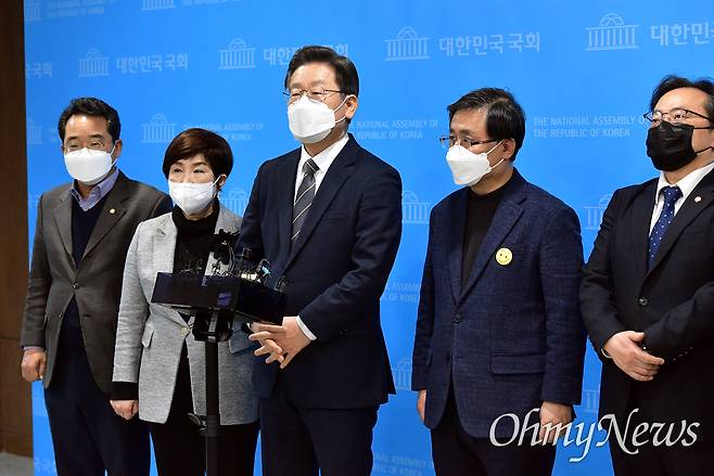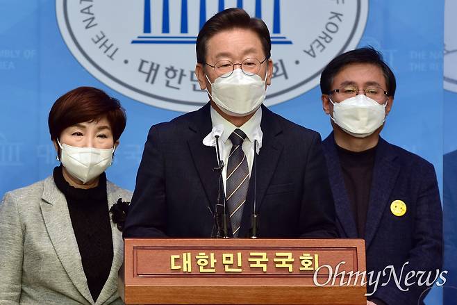 | ▲ 이재명, 대선후보 긴급회동 제안 "35조 추경 논의" 더불어민주당 이재명 대선후보가 21일 오전 서울 여의도 국회 소통관에서 긴급 기자회견을 열고 코로나19 소상공인과 자영업자 피해 지원을 위한 35조원 규모의 추가경정예산(추경) 편성을 위한 여야 모든 대선후보 간 긴급 회동을 제안하고 있다. |